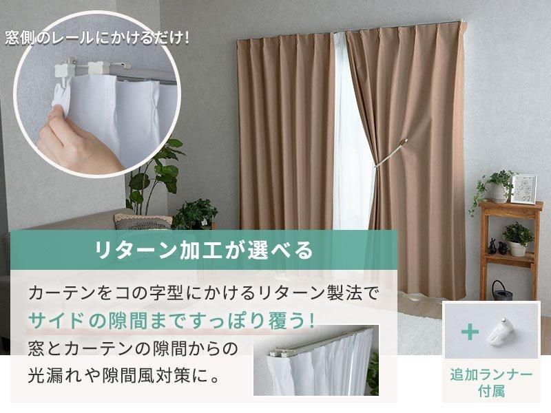 カーテンの左右を窓側のカーテンレールにかけてすき間を遮ることで、光漏れやすき間風を防ぎます。