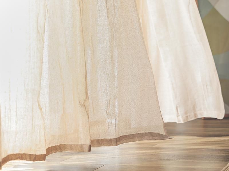 優しい手触りや風合いが特徴の天然素材。静電気が発生しにくいのでホコリや汚れがつきにくく、通気性にも優れています。しかし、生地自体の自重や湿度などで使用しているだけで丈が伸びたり、製造時期によって生地の色味や風合いが異なるなど特有の性質がございます。これも天然繊維ならではの特徴としてご理解ください。