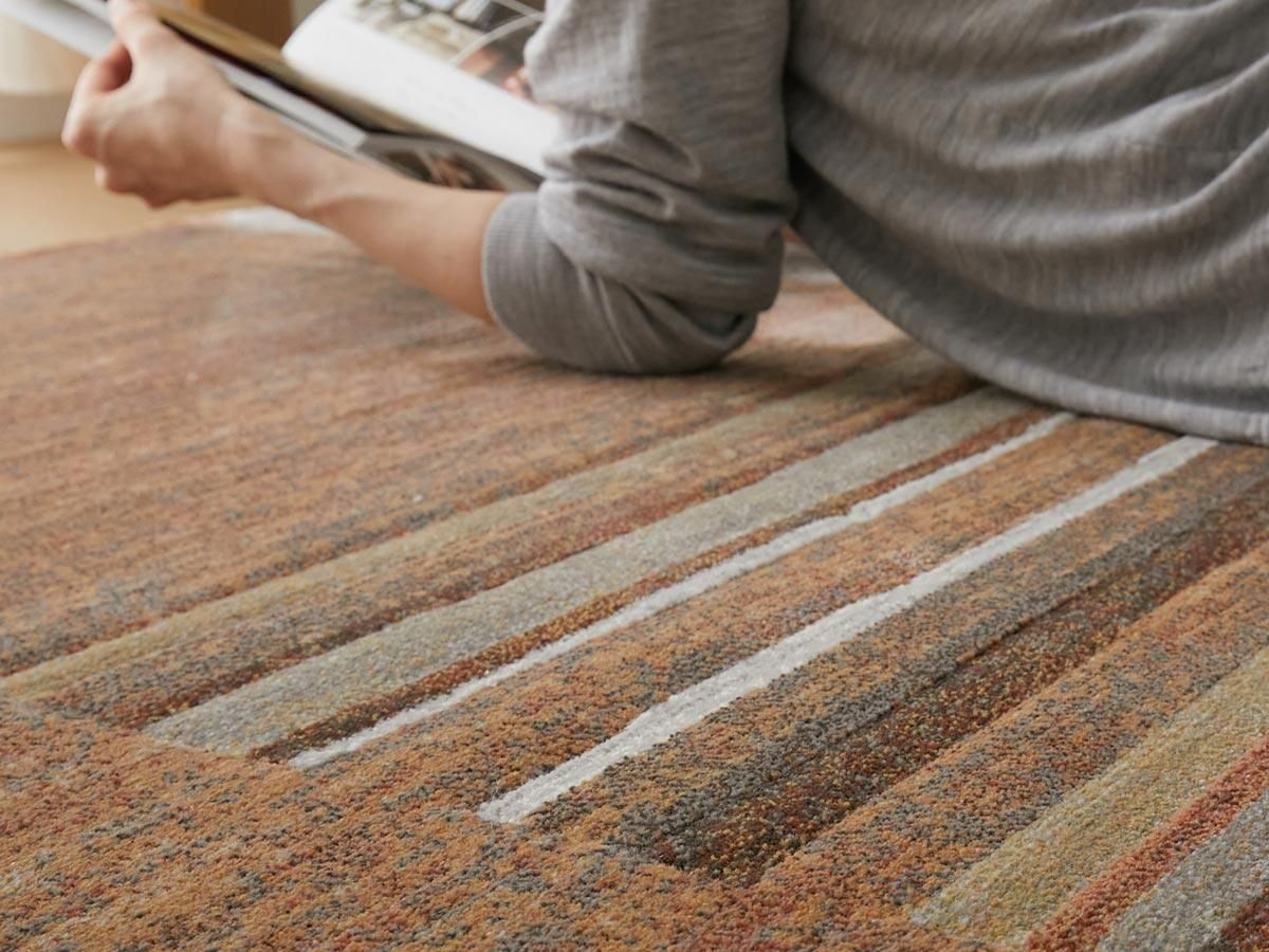 > ヨーロッパ輸入カーペット > 落ち着いた色合いと繊細な織模様が洗練された印象。スタイリッシュなデザインでお部屋のアクセントにピッタリなベルギー産の高密度ウィルトンラグ『アータム オレンジ』