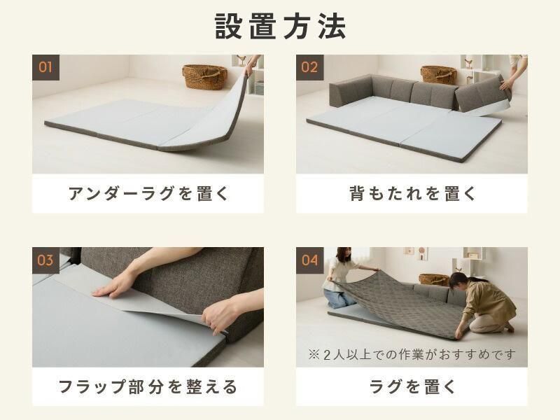 | 素材 | 【ラグカバー】 表面:ポリエステル100% 中材:ポリエステル100% 裏面:ポリエステル100% 【アンダーラグ】 表面:ポリエステル100% 中材:ウレタン4cm(25D) 裏面:ポリエステル100%(ドット付) 【背もたれ】 表面:ポリエステル100% 中材:ウレタン(20D)+ポリエステル綿 |