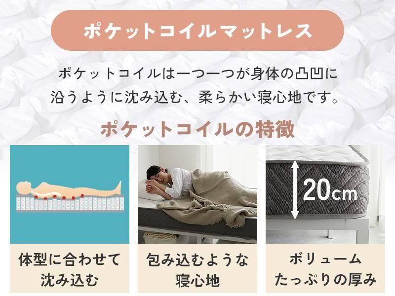 | サイズ | <ポケットコイル> セミシングルショート:幅約80×長さ約180×厚み約20cm シングル:幅約97×長さ約195×厚み約20cm セミダブル:幅約120×長さ約195×厚み約20cm ダブル:幅約140×長さ約195×厚み約20cm <ボンネルコイル> セミシングルショート:幅約80×長さ約180×厚み約15cm シングル:幅約97×長さ約195×厚み約15cm セミダブル:幅約120×長さ約195×厚み約15cm ダブル:幅約140×長さ約195×厚み約15cm |