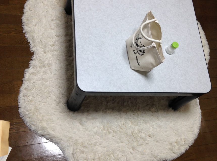 テーブルを置くなら小さめのものが良いと思います。写真のテーブルは75cm×75cmです。個人的にはこれよりもテーブルが小さいか絨毯が大きい方が良いと感じています。
